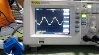 以前にeBayで入手したクランプ型電流(CT)センサを繋いで実際の電力測定にチャレンジ。周りにあった縦型扇風機を繋いで、電流波形がどのようになっているかを確認。左はスイッチを入れていないときの波形なのでノイズ。右はファンを起動したときの波形...