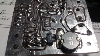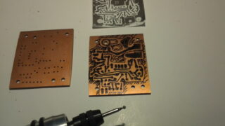 一次試作の2台が無事に安定動作することが確認されたので、次は量産を想定した二次試作に。きちんとした基板を作成して表面実装の部品もできるだけ利用し、コストダウンを図りつつ、調整を不要とすることを目的に。パタンはフリーの水魚堂さんのMBEを利用...
