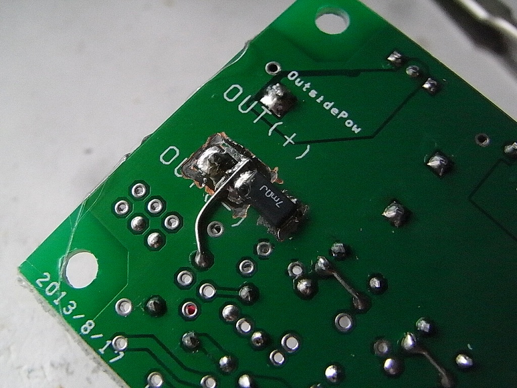 耐お陽光パネルの最大出力電流が2.5Aとあまり多くはないので、元々の設計では、電流測定は不要と考えていたのだが、何らかの原因で異常電流が流れて発火してもシャレにならないので、基板を手改造して電流測定回路を組込んだ。