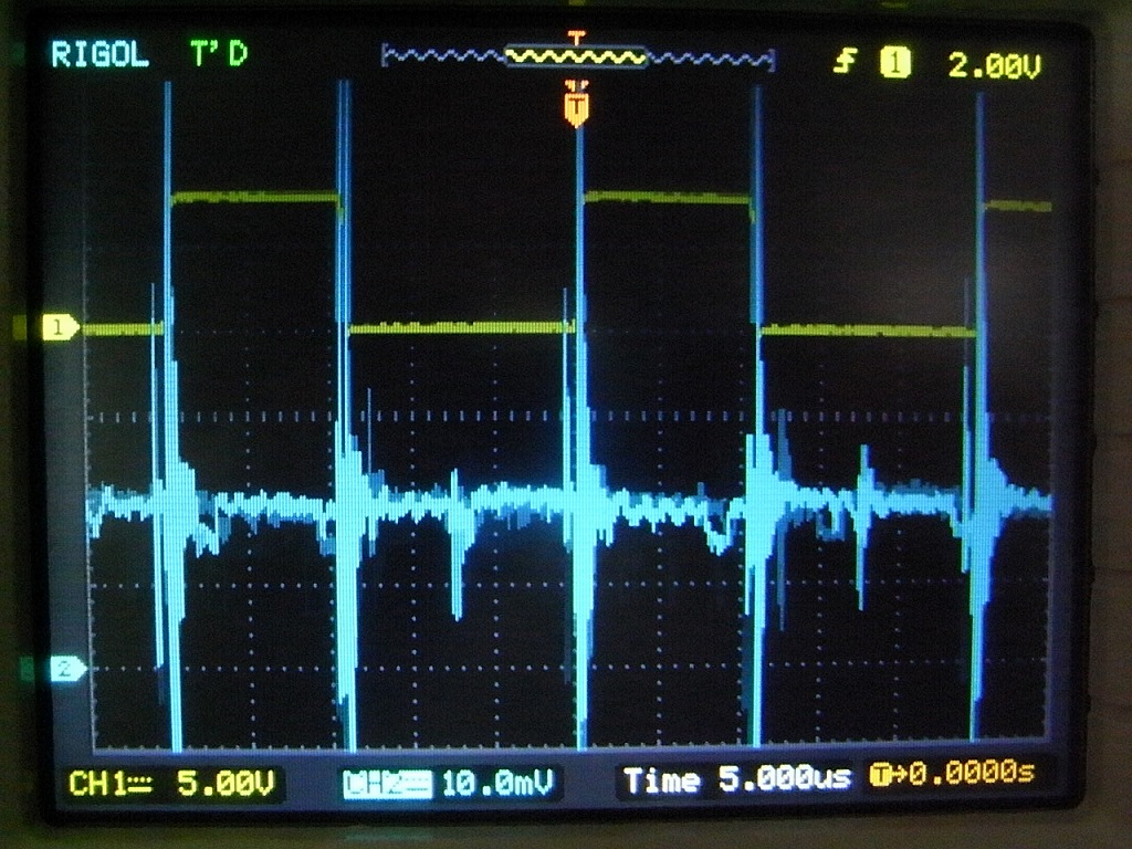 ただ、小さな抵抗なので、電圧降下も小さい。7mΩの場合、1Aで7mVしか電圧降下が無く、精度高く測定するのは難しい。ま、電流オーバーの保険がわりなので、それほどの精度は求めないと言うことで良しとしている。オシロで抵抗の両端の電圧を測定するとこんな感じ。(写真の青グラフ)ちなみに、黄色はPWMによるFETのゲート制御制御信号。スイッチングノイズがシャント抵抗の電圧にもろに表われてしまっているのは仕方ないが、測定点のタイミングを合わせてやれば、そう大きな問題とはならないことは検証済み。