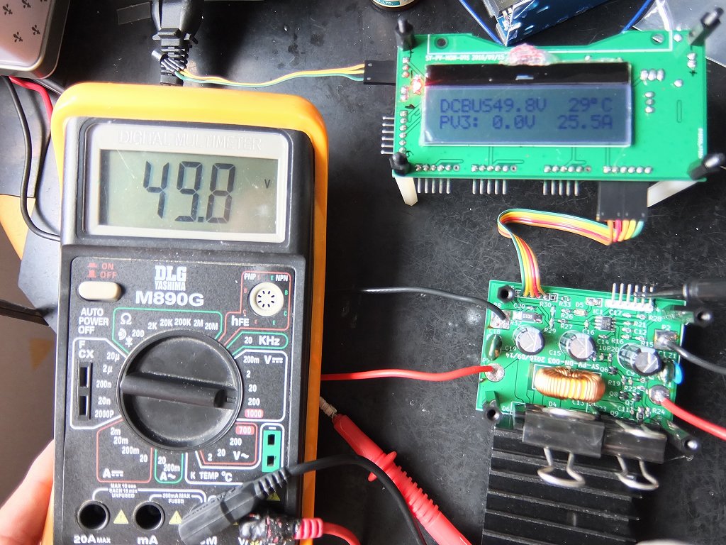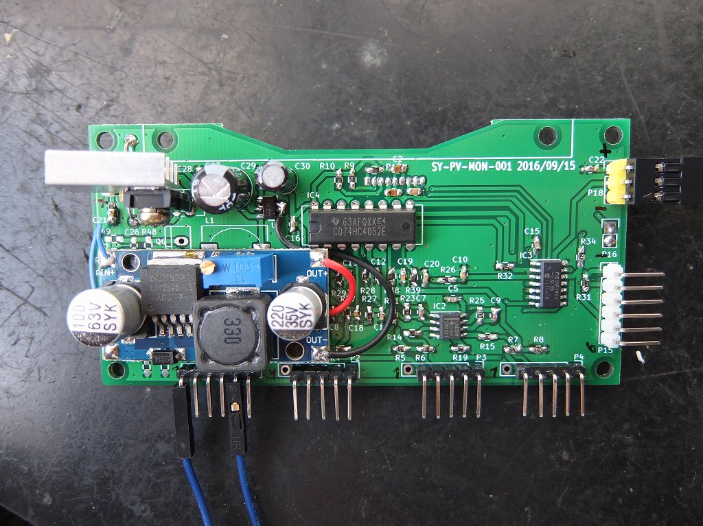 この上に、監視基板を配置して監視情報を液晶パネルに表示するようにした。パネルには1秒おきにμMPPT1から4の電流、電圧を順番に表示し、放熱板の温度を同時に表示することにした。さらに、放熱板の温度が上昇しすぎた場合は、μMPPTの動作を停止するフィードバック機能も搭載した。