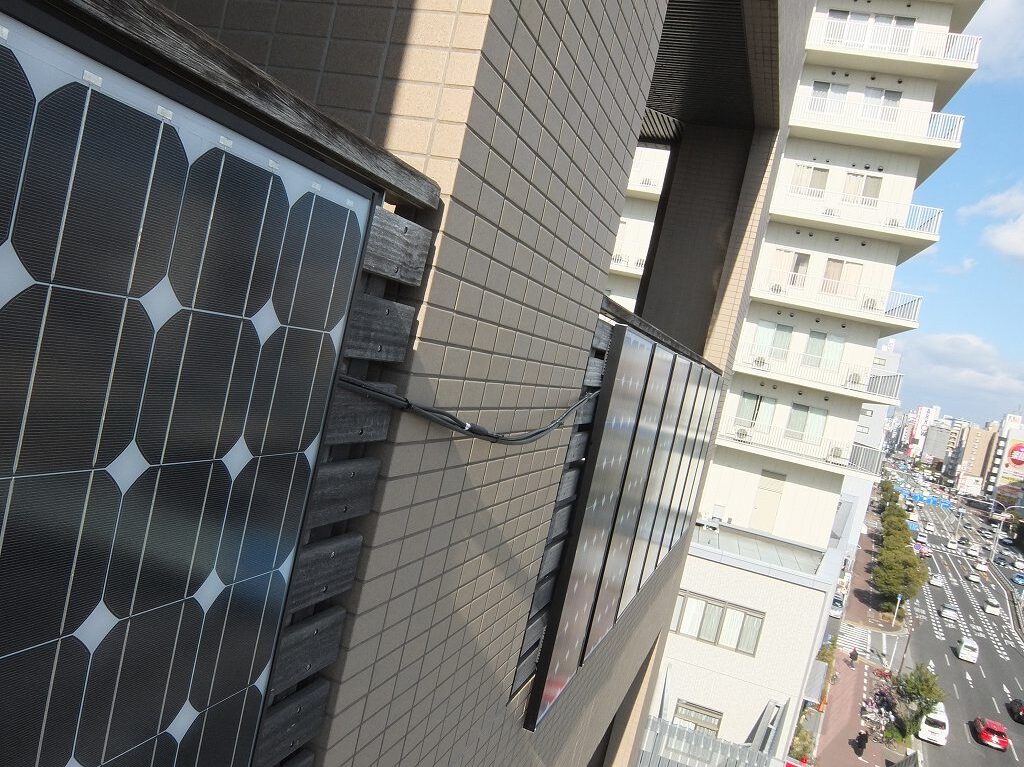特に、6Fのベランダ柵の外側に設置する太陽光パネルの工事方法について、安全性を確保しつつ、工事器具や部材の落下を防止する措置では低コストでの実現方法に工夫を頂いた。通常であれば足場を組むところだが、それではコストも工期も跳ね上がるため、パネルをワイヤーで手すりと接続することでパネルの落下を防止し、柵外でなく、ベランダ側から作業をすることで作業者の安全を確保する方法を考えた。