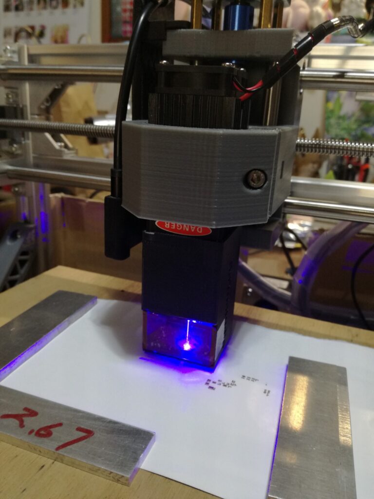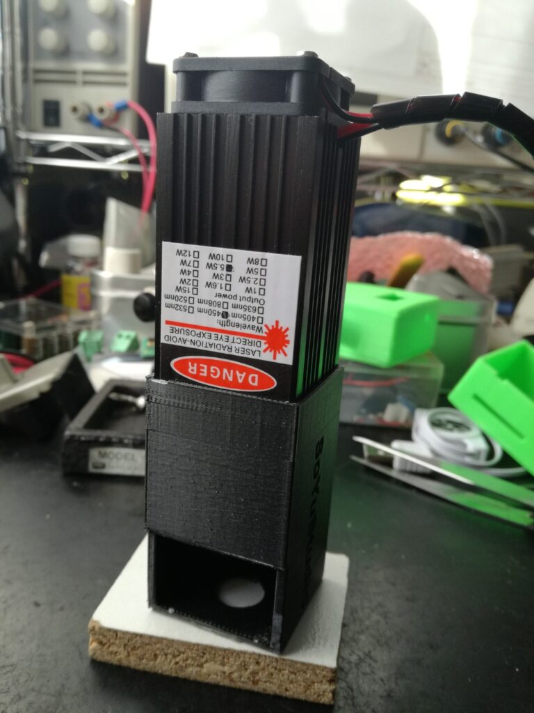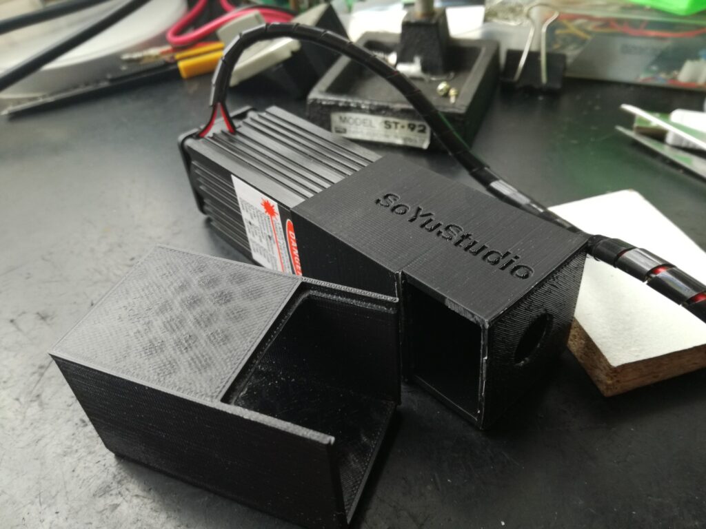 さっそく3Dモデリング。最初のモデルは、サイズギリで作るとレーザーモジュールが入らず失敗。少し微修正して再プリント。今度は何とかうまく挿入。