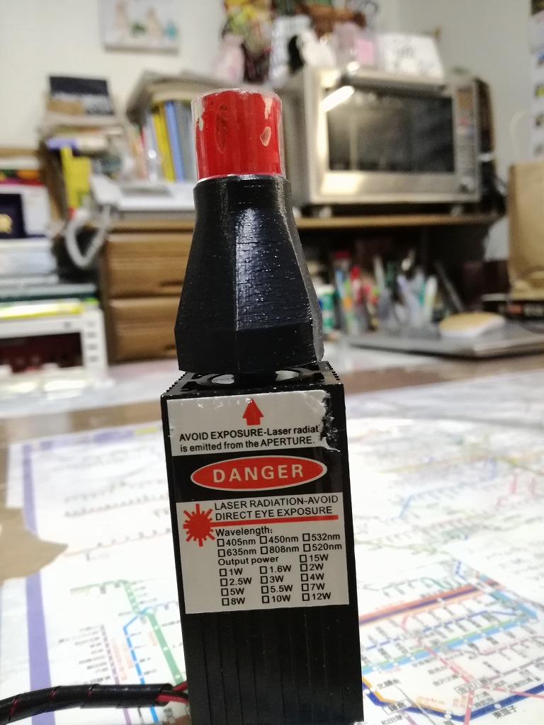 レーザーモジュールにはめてみたところ。なんだか、ミニュチュアのお酒のボトルのようだが。。。