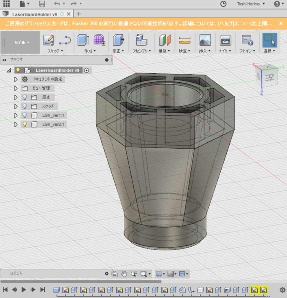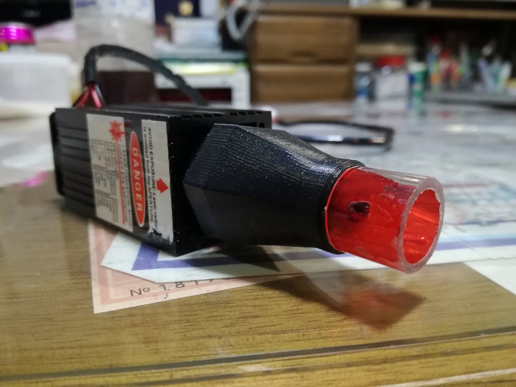 上部はレーザーモジュールの焦点調整ダイヤルにはめることでシールドを回せば焦点が調整できる仕組み。下部に透明の筒をはめて加工部が見えるようにする。透明の筒にはレーザーの目に有害な波長の光を除去するフィルタを取り付ける。