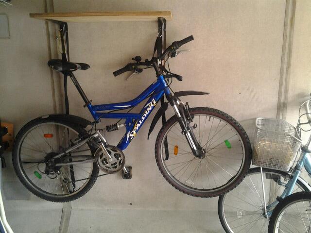 今回は、その時の部材を利用し、まともなドリルの歯を新調し再度トライ。それなりの歯を使えば、コンクリにもきちんと穴があき、棚プラス自転車吊り下げフックの設置が完了。これで1台分のスペースが確保できた。