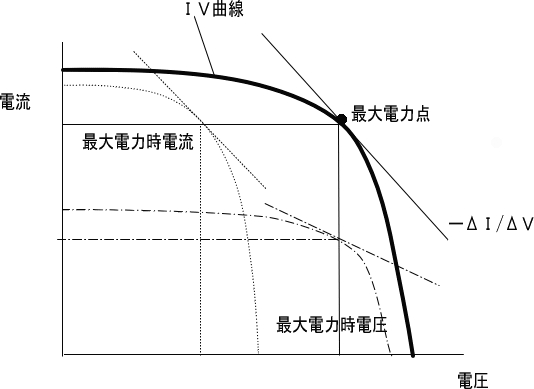 ところが、当る光の強さによって、この電圧-電流曲線自体が上下に変動してしまう。更に、パネルの一部が電柱などの影で遮られると、電圧-電流曲線が、ゆがんでこぶが二つに割れたような特性になる。