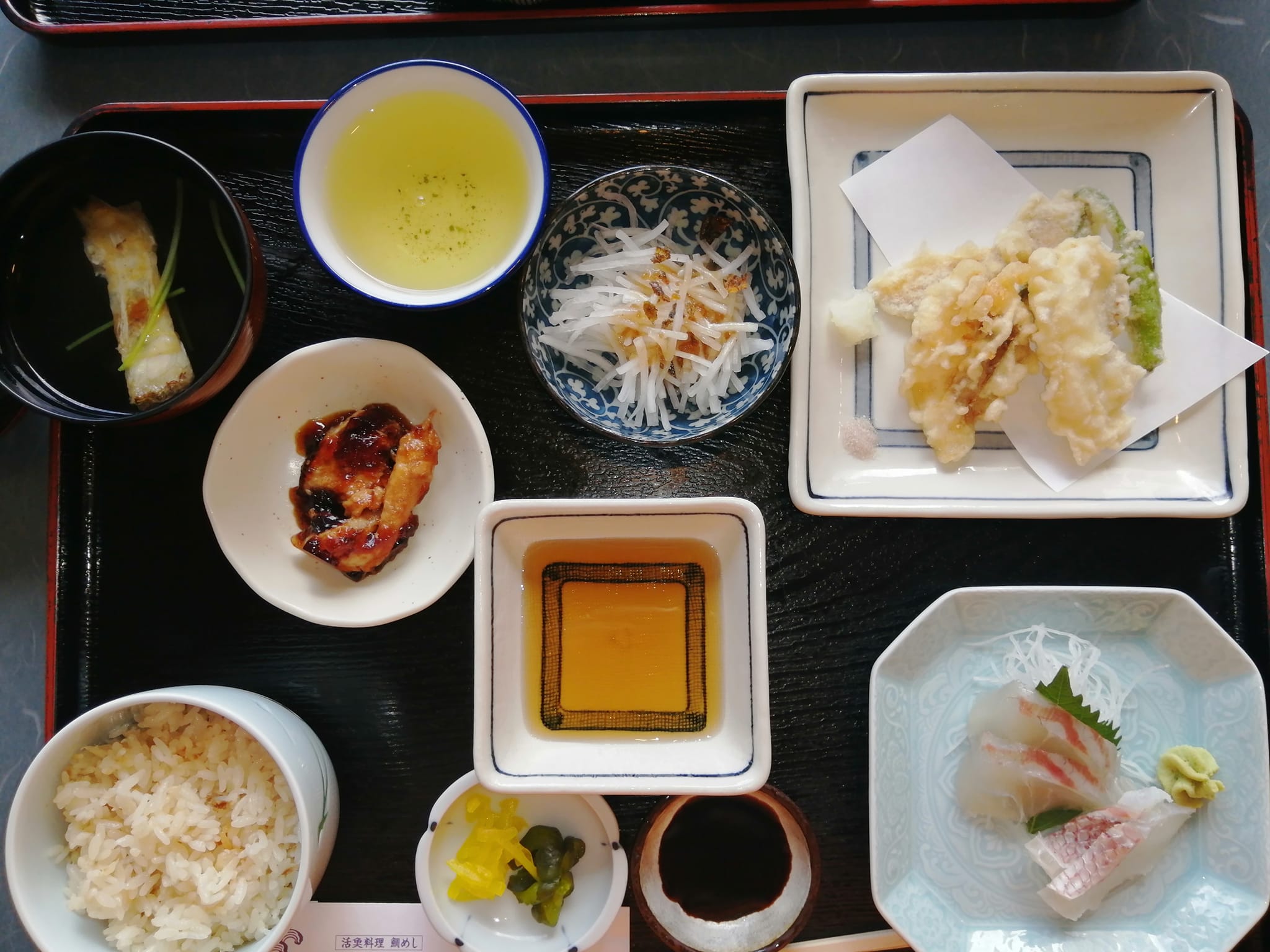 鯛のお造り、天ぷら、塩焼き、煮付けから2品、もしくは3品を選べる鯛めしランチがなんと言ってもお勧め。私はお造りと天ぷらを選びました。鯛の煮こごり、鯛のおすましも付きまさに鯛ざんまいで、2品なら1700円弱ととってもお得!機会があればぜひお試しください。