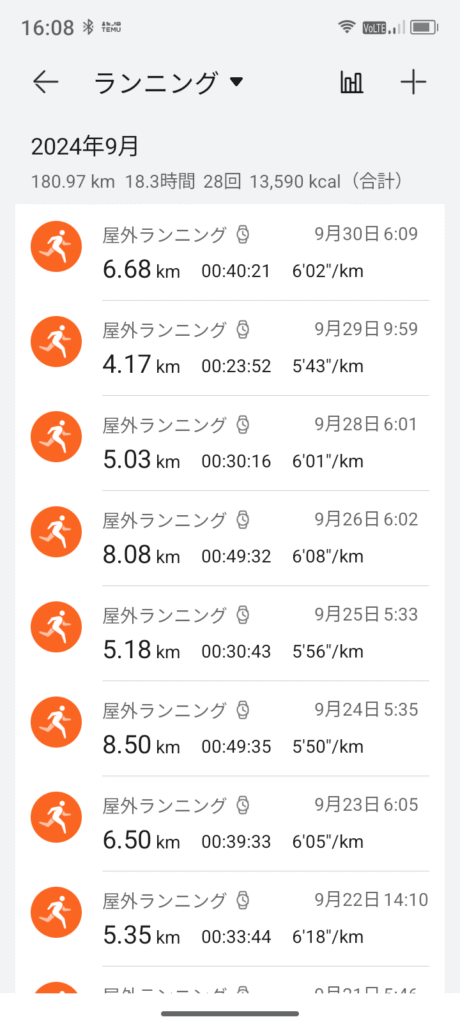 ランニング 2024年9月 ラン&バレー X Facebook はてブ LINE コピー 2024.09.302025.08.30 今朝は6km走って9月のラン総距離180km達成1回の距離もできるだけ長く走れるようにして8km、10kmを走る回数を増やしつつある。 さて、次の目標は月間200kmか!?