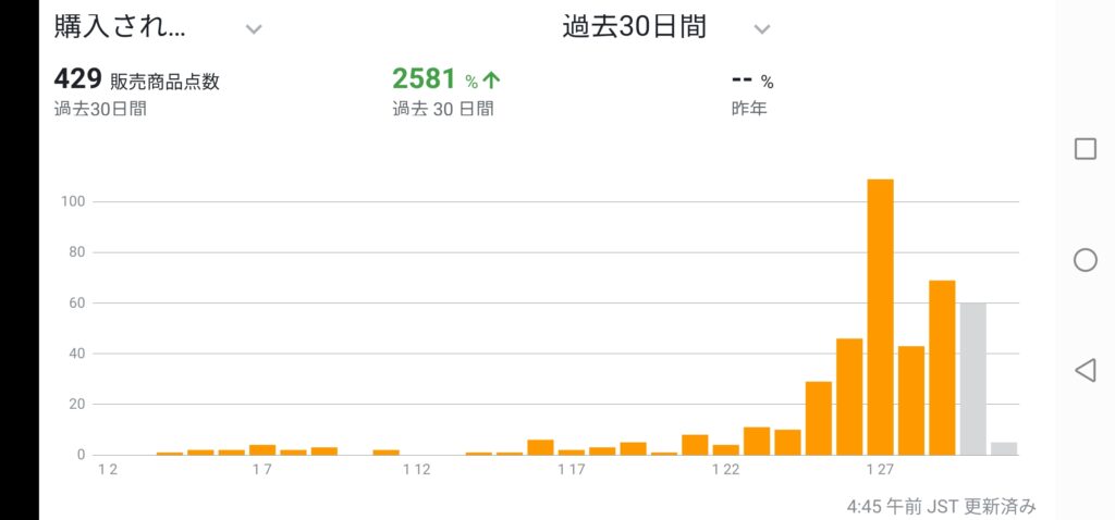 「おおっ!いいじゃんいいじゃん」とちょっとほくほくとしていると・・・・20日過ぎにいきなり爆売れ開始!