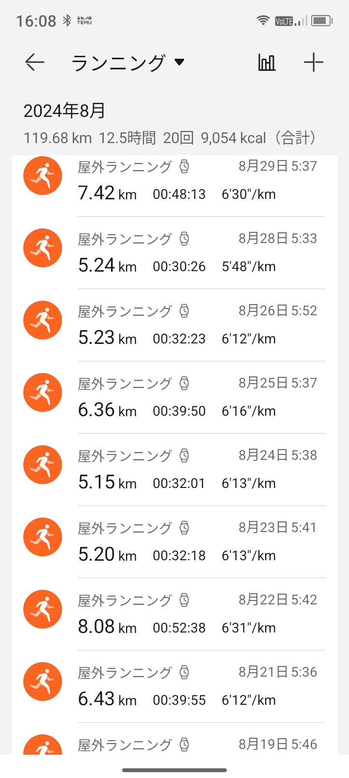月間ランニング 2024年8月 ラン&バレー X Facebook はてブ LINE コピー 2024.08.312025.08.30 今月は、急遽帰省しなければならなくなり、丸々1週間走れなくなってしまったので、7月に171kmまで伸びた月間ラン距離は120kmと減少してしまった。また、7月には40まで上昇していたVO2Maxだが、走れない期間により38まで低下してしまった。せっかくインフルコロナからの完全復活だったのにちょっと気を抜くとすぐに落ちてしまう。体力を維持するのも大変なことを実感する。パフォーマンスを維持を心がけながら体を壊さぬ程度に頑張る!