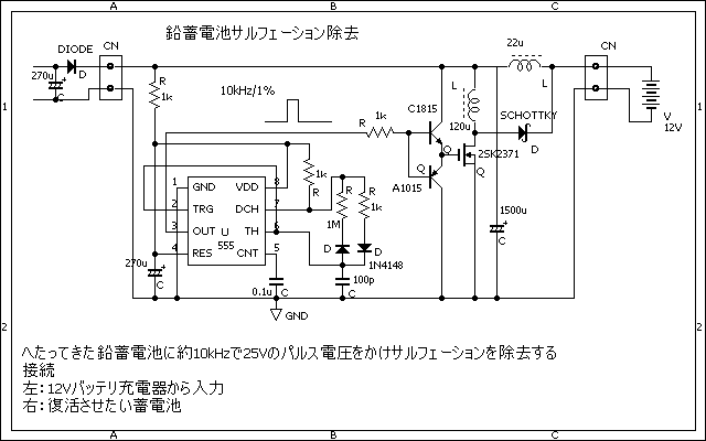 タイマ555を使い始めたついでに、かねてより作ろうと思っていた鉛蓄電池の復活装置を作り始めてみた。ご存じの通り、自動車用のバッテリは、鉛蓄電池です。重たいです。車検の時にバッテリがそろそろへたってきたので取替えましょうねと言われ、勧められるままに交換する方も多いと思います。概ね2年程度で寿命を迎えると言われています。
