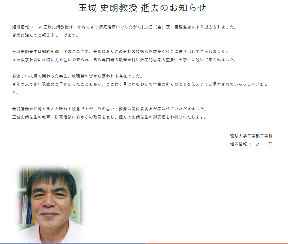 実はこの後、2020年7月10日に玉城先生はご逝去されてしまう。お話しした時も、顔色があまりよくなく、以前(2000年頃)に一緒に仕事をしていた時に比べてずいぶん疲れた印象だったが、闘病していたと後で知ることになる。心よりご冥福をお祈りいたします。