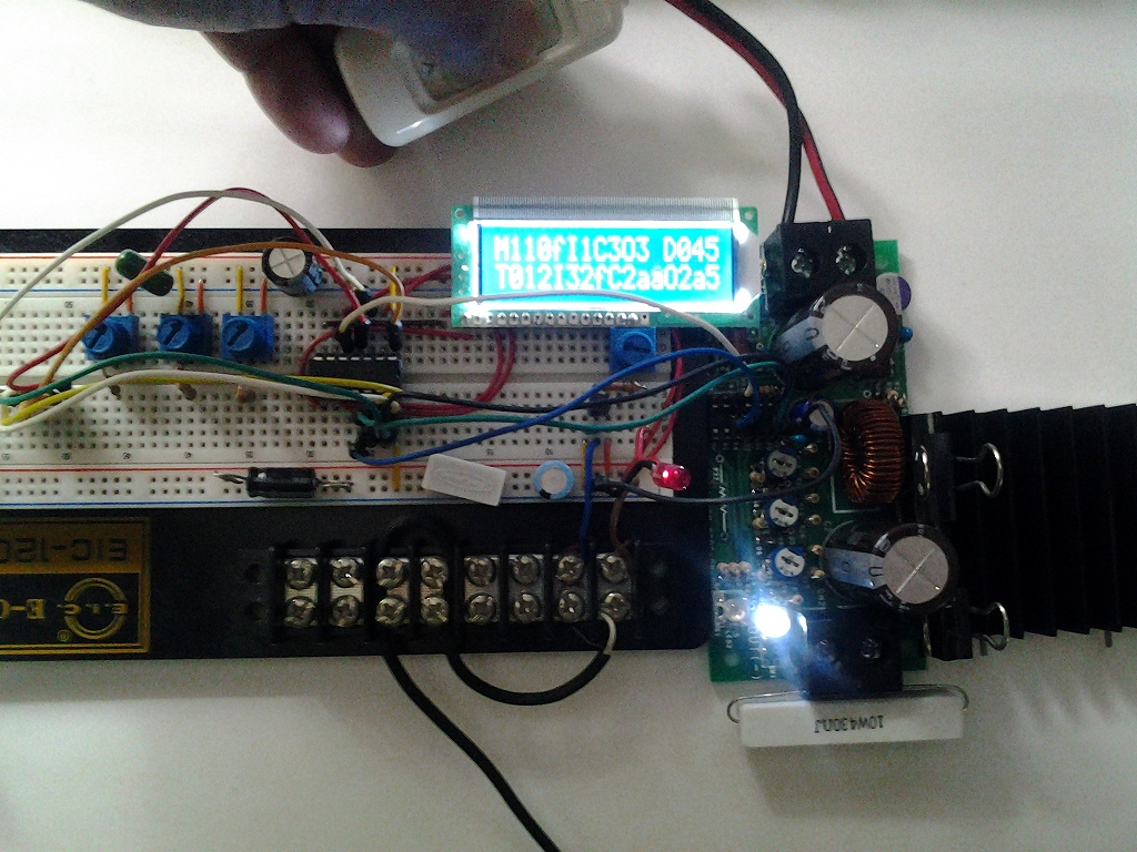 基板には、表示系としてはLEDが2個載せてあるだけで、詳細な状況を確認することができないので、ブレッドボードのPICと液晶表示パネルを利用し、基板からは電圧測定値を引き出し、PWMクロックを入れる線をつないで動作検証しているところ。