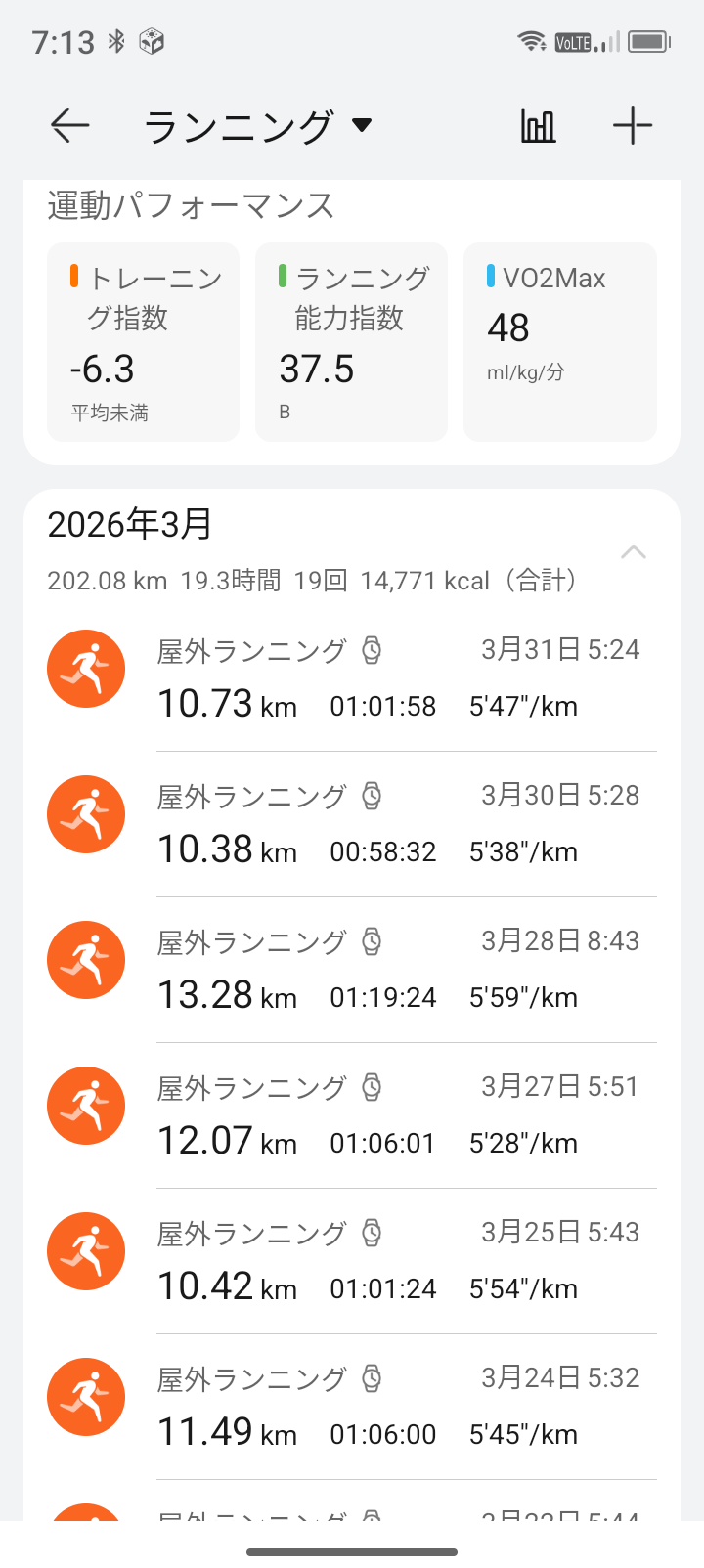 楽に走れるときは10km+αを心がけた結果、19回で何とか200kmを達成できた。
