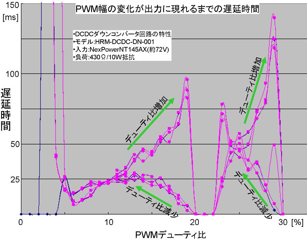 2.PWM幅が増加の場合と減少の場合で遅延時間変化の傾向が異なる