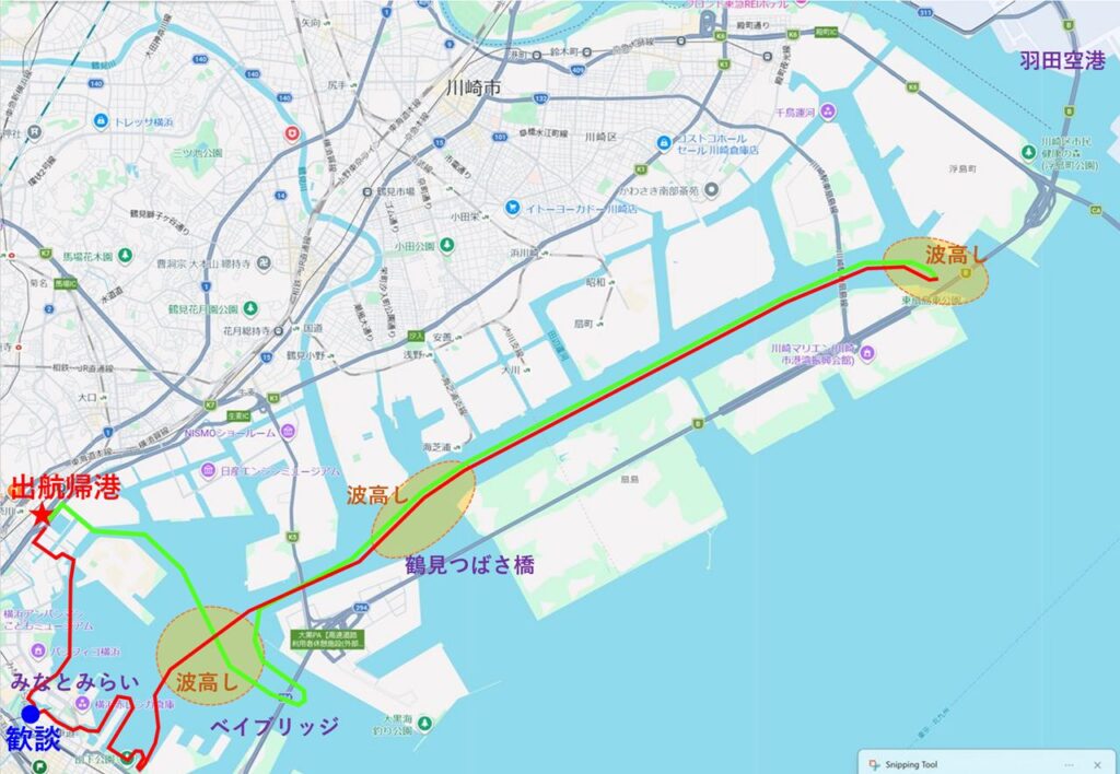 京浜運河の出口に近づくと、再び波が高くなり、その先には白波が多く立っていることが見て取れるほどでしたので、羽田空港まで近づくことは断念して引き返すことに。