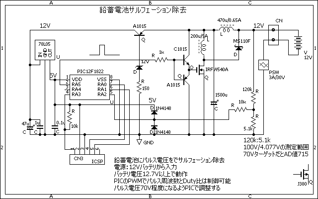 先ず、電源を復活延命対象のバッテリから取得するようにした。バッテリの状態を把握し、パルスの電圧を監視し、パルス周期、パルス幅を可変できるようPICマイコンで制御するようにした。電源電圧が一定以下になったら、PICマイコンの電源をOFFするようにした。