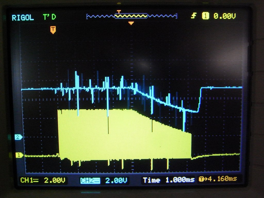 ところが、パルスが停止しているところを時間軸を縮めて観察してみると、以下の現象が観察された。青は三端子レギュレータに供給される12V電源ライン。黄色はパルスの発生状況。
