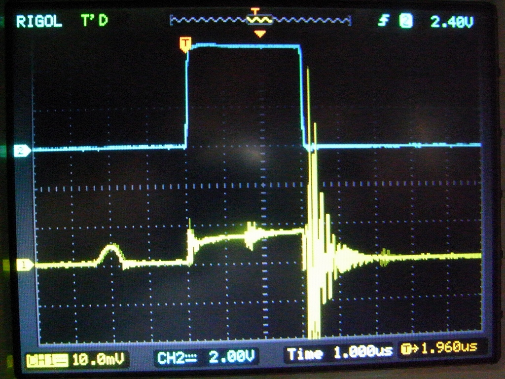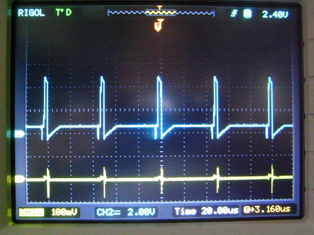青(上)がFETのゲート制御部、黄色(下)はFETのソース側7mΩの抵抗の電圧降下、つまりは電流値。左は時間軸が20μsなので、50μs周期(20kHz)で発振していることが分かる。右は時間軸を1μsに引き延ばしてひとつのパルスを観察しているところ。ゲートが開くと、FETに流れる電流は、ドレイン側に接続されたインダクタを通して流れ始め、ゲートが閉じると激しくサージ電圧が発生している。これらは、設計どおりだ。