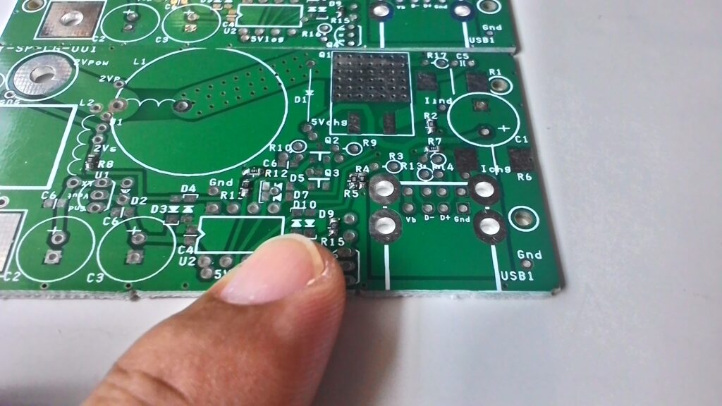 まずは基板。パネライズして作成したのをカットしたもの。11枚あるが、とりあえずは2枚を二次試作する。部品はいつものように背の低いチップ部品からヘッドルーペをかけて精密ピンセットでつまんではんだ付け。1608チップ(1.6×0.8mmサイズ)は慣れてお手の物。が、一瞬気を抜いてピンセットから落としてしまうのは如何ともしがたく。一度落とすと、ほぼ発見は不可能。慎重に扱わなければならない。爪先のR15文字の上に付いているのが1608の抵抗だ。